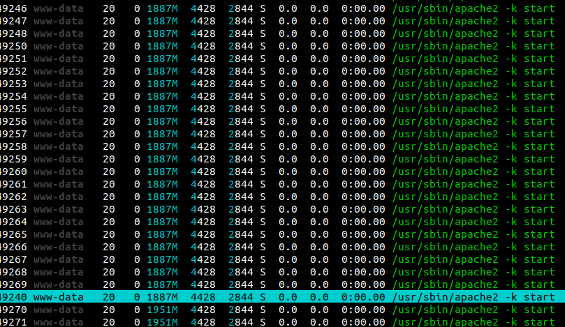 htop확인 - 웹 서버는 많은접속이 들어올 수 있기 때문에 많은 접속 상황에서 분산 처리하기 위해 많은 프로세스가 실행 됨![]()