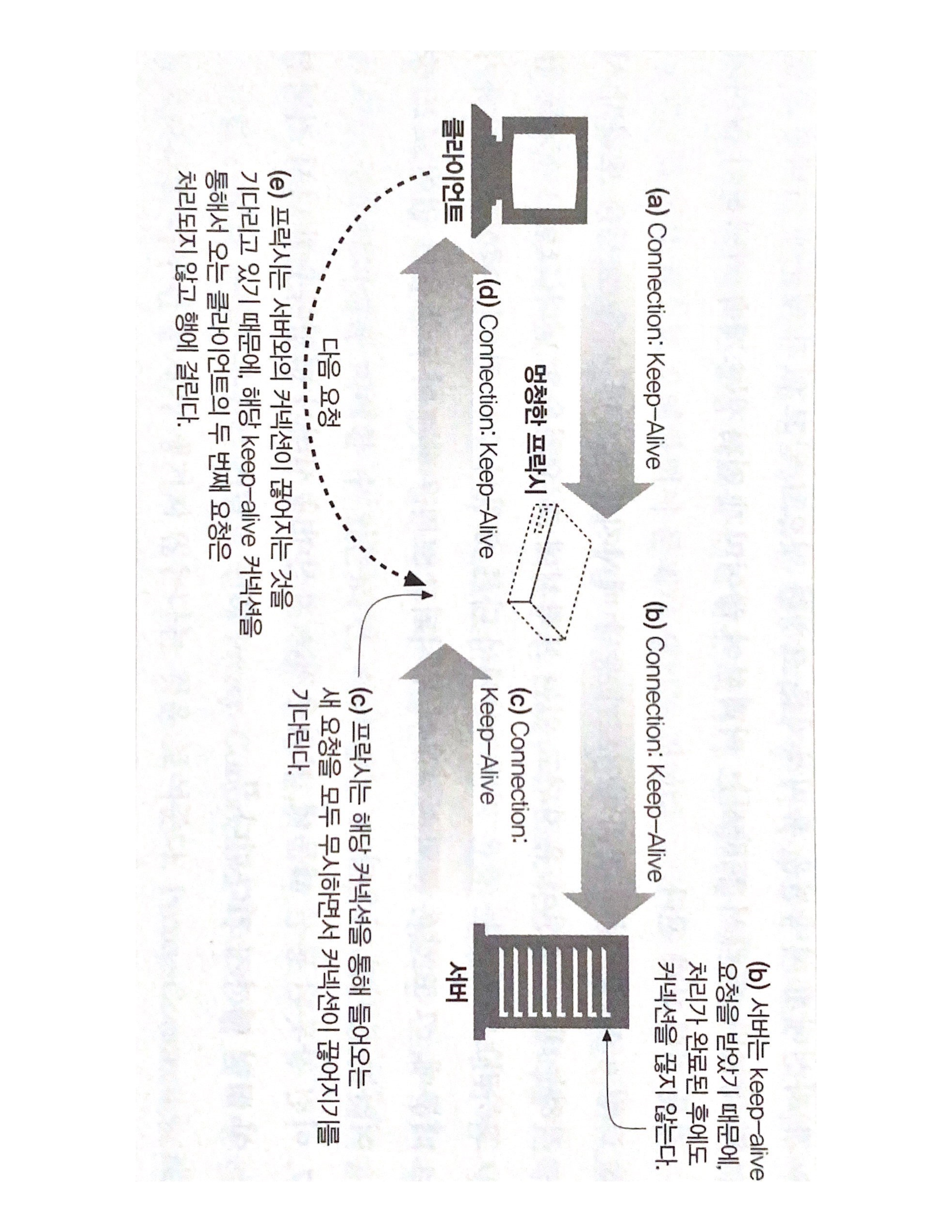 Connection:Keep-Alive는 b까지 전파되지 않아야 하는데, 멍청한 프락시 문제로 서버에선 proxy가 커넥션을 유지하자고 요청하는 것으로 잘못 판단하게 된다. - 프락시는 서버가 커넥션을 끊기를 기다리지만 서버는 프락시가 Keep-alive를 요청한 것으로 알기때문에 끊지 않는다.